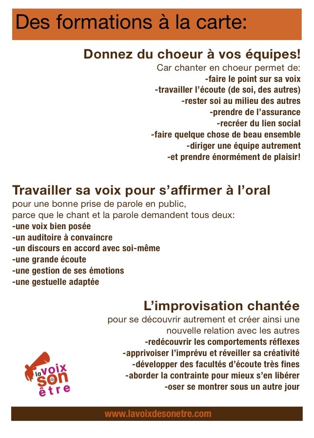Réveiller les talents et compétences de chacun autour d'une activité de création de chanson. Formation sur 1 ou 2 jours. Public concerné: salariés , cadres ou personnels d'entreprise. Programme et tarifs sur demande.